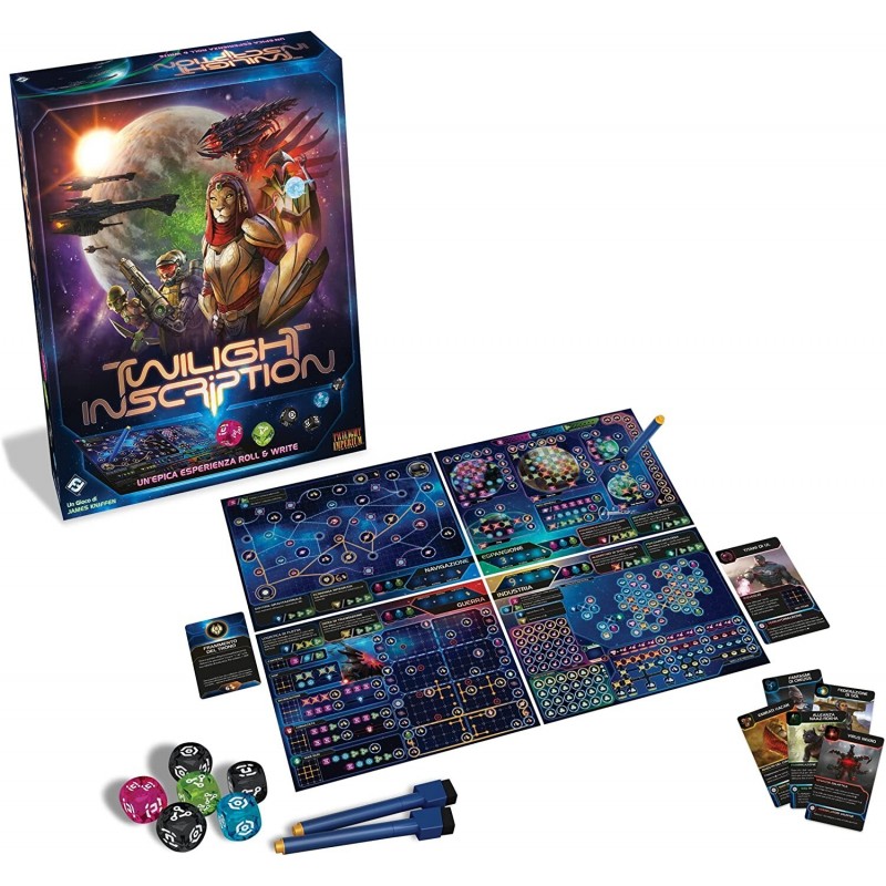 AMMIRATE L’ASCESA DI UN IMPERO: I dadi di grandi dimensioni e i pennarelli brillanti ndono vita alla galassia sulle schede dei giocatori, cancellabili e riutilizzabili.